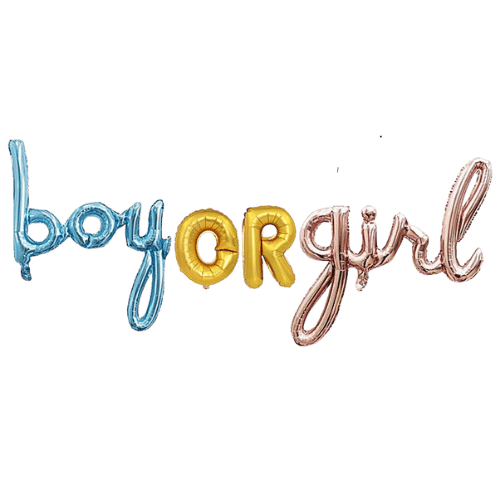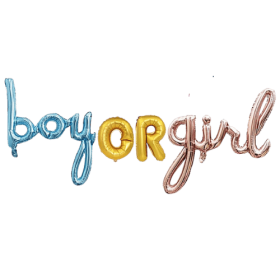 Set de Letras de foil "Boy OR Girl". Los globos de foil o metálicos están hechos de poliamida por lo que son duraderos. Mide Boy: 80x79cm y Girl: 90x64cm. Cada set contiene 4 globos. Se vende sin inflar.
